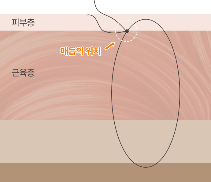 근육층 사이 깊숙이 넣어 피부 위로 실이 비쳐 보이는